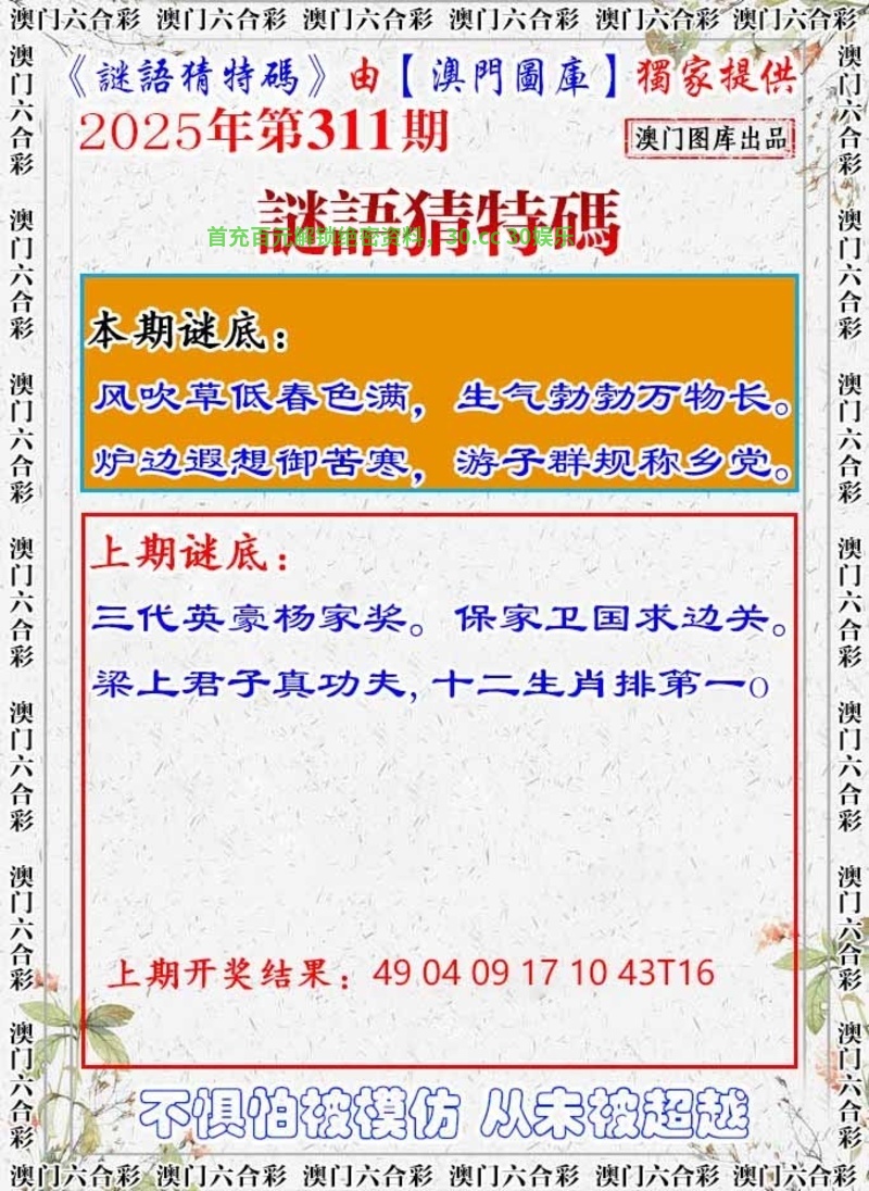 311期:【謎語猜特碼】 风吹草低春色满,生气勃勃万物长。 炉边遐想御苦寒,游子群规称乡党。 七肖:马羊蛇虎猪猴兔 四肖:马羊蛇虎 |